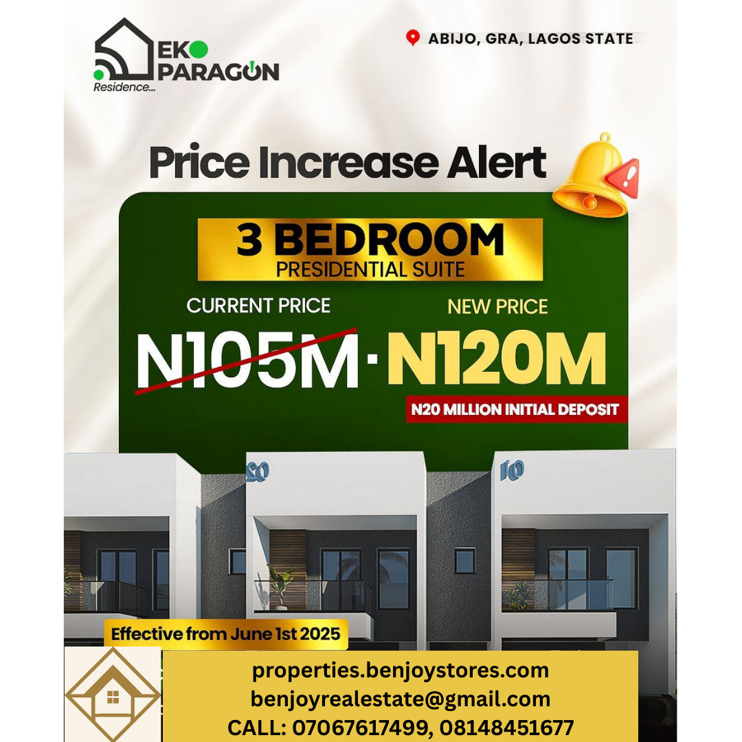 The Eko Paragon 3-Bedroom Presidential Suite is a premium apartment located in the Eko Paragon Residence, situated in Abijo G.R.A., Lekki, Lagos. It is a few minutes from major Landmarks like Caleb British International School, also a few minutes from Churches, mosques and major expressway. Developed by LSPDC, Ace Royal, GIDI. This development offers a blend of luxury living and hotel-style services, making it ideal for both homeowners and investors.