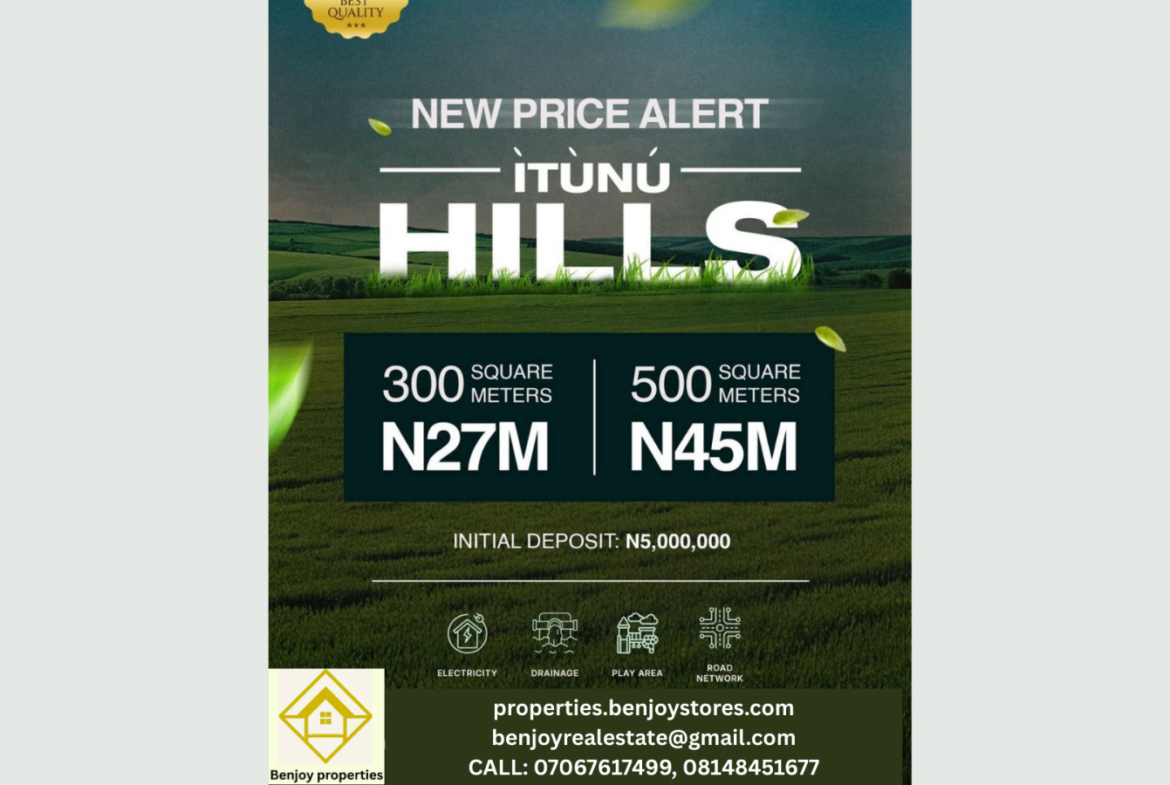 Itunu Hills is designed with modern infrastructure to ensure comfort and security: Perimeter fencing with gated entrance, Well-constructed road network and drainage systems, 24/7 security surveillance, Reliable electricity supply, Recreational parks and green areas.
