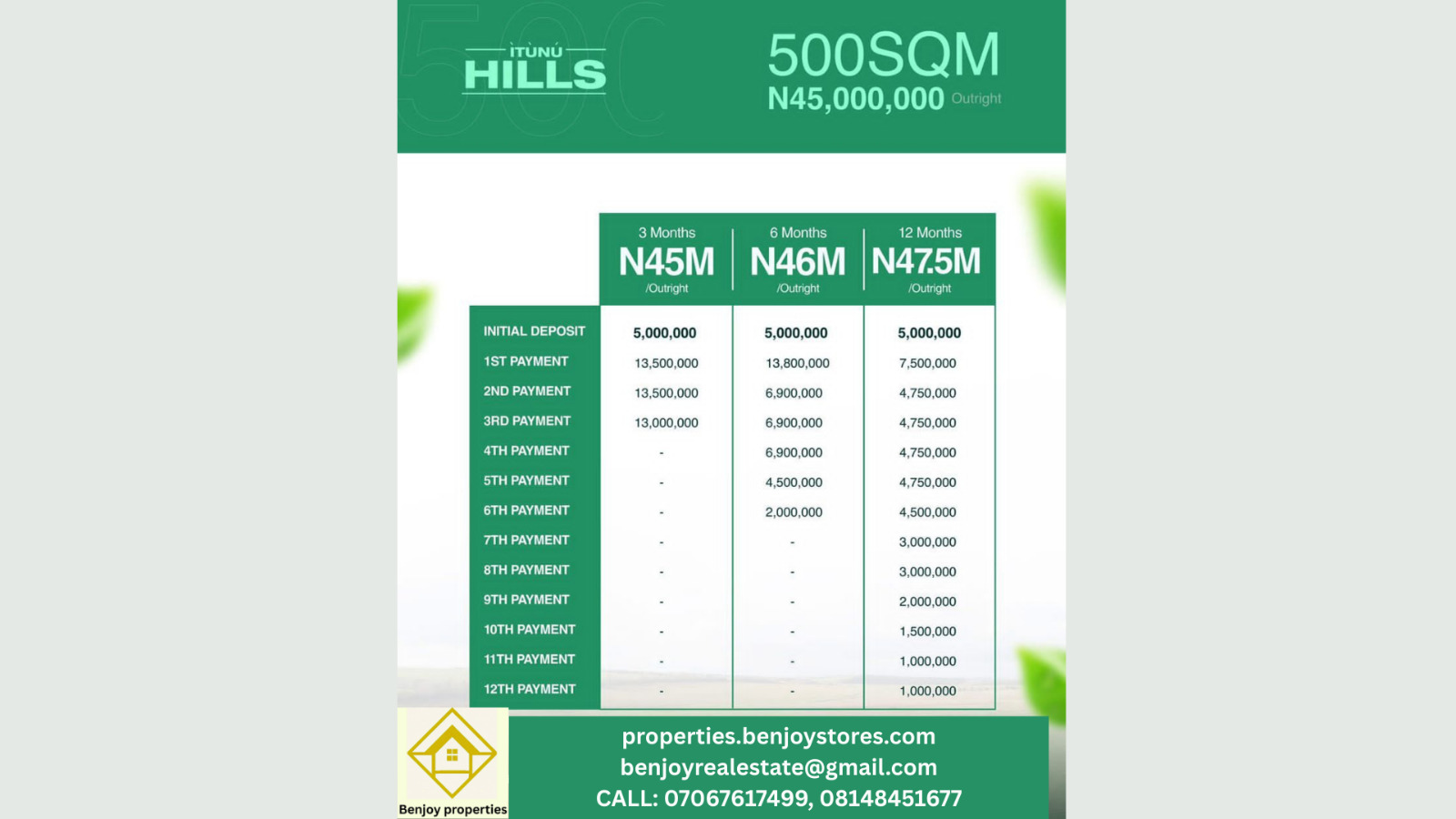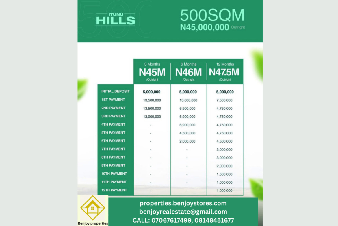 Itunu Hills offers instant allocation upon full payment, providing investors with immediate possession and the opportunity to commence development or resale.